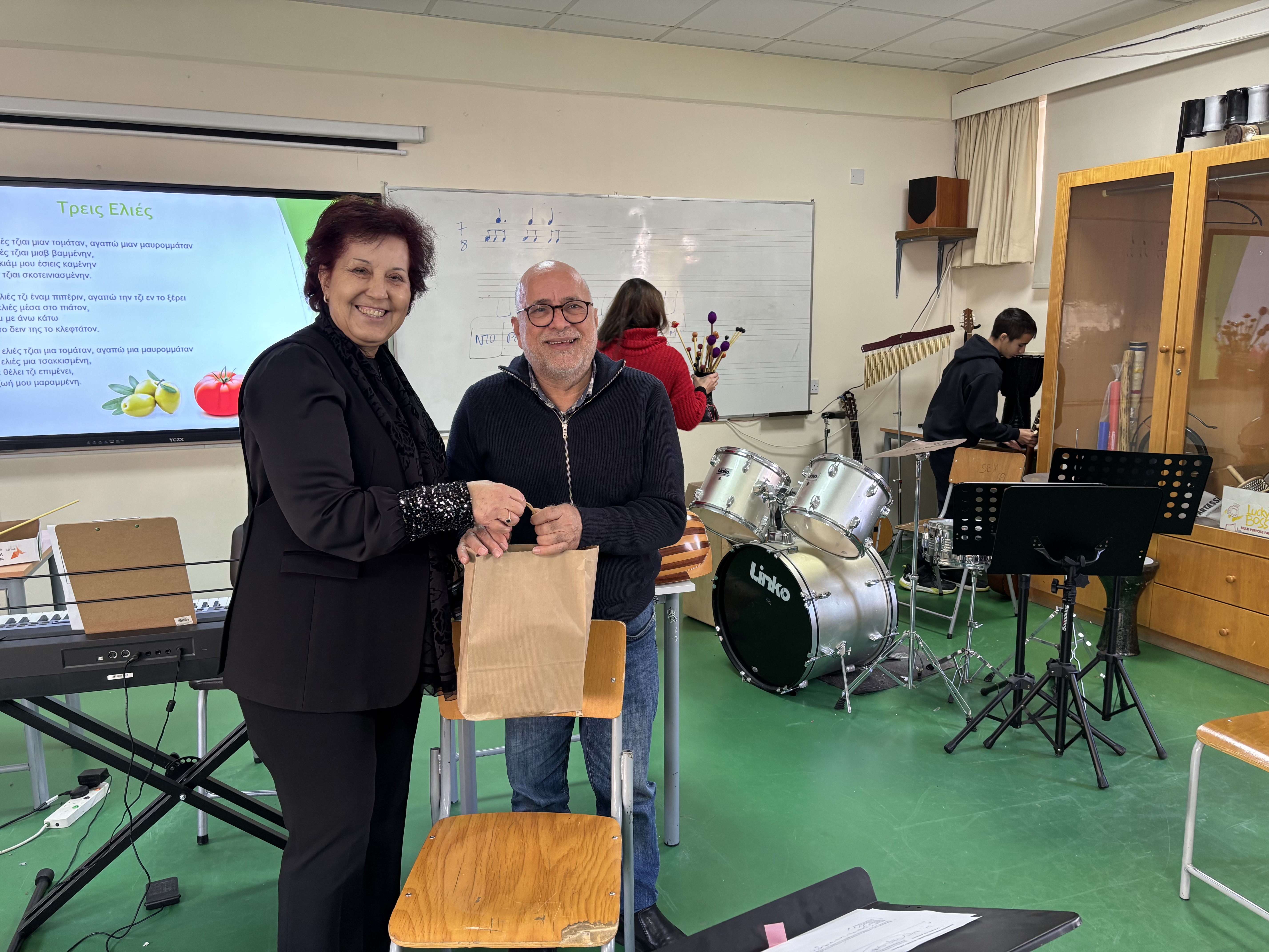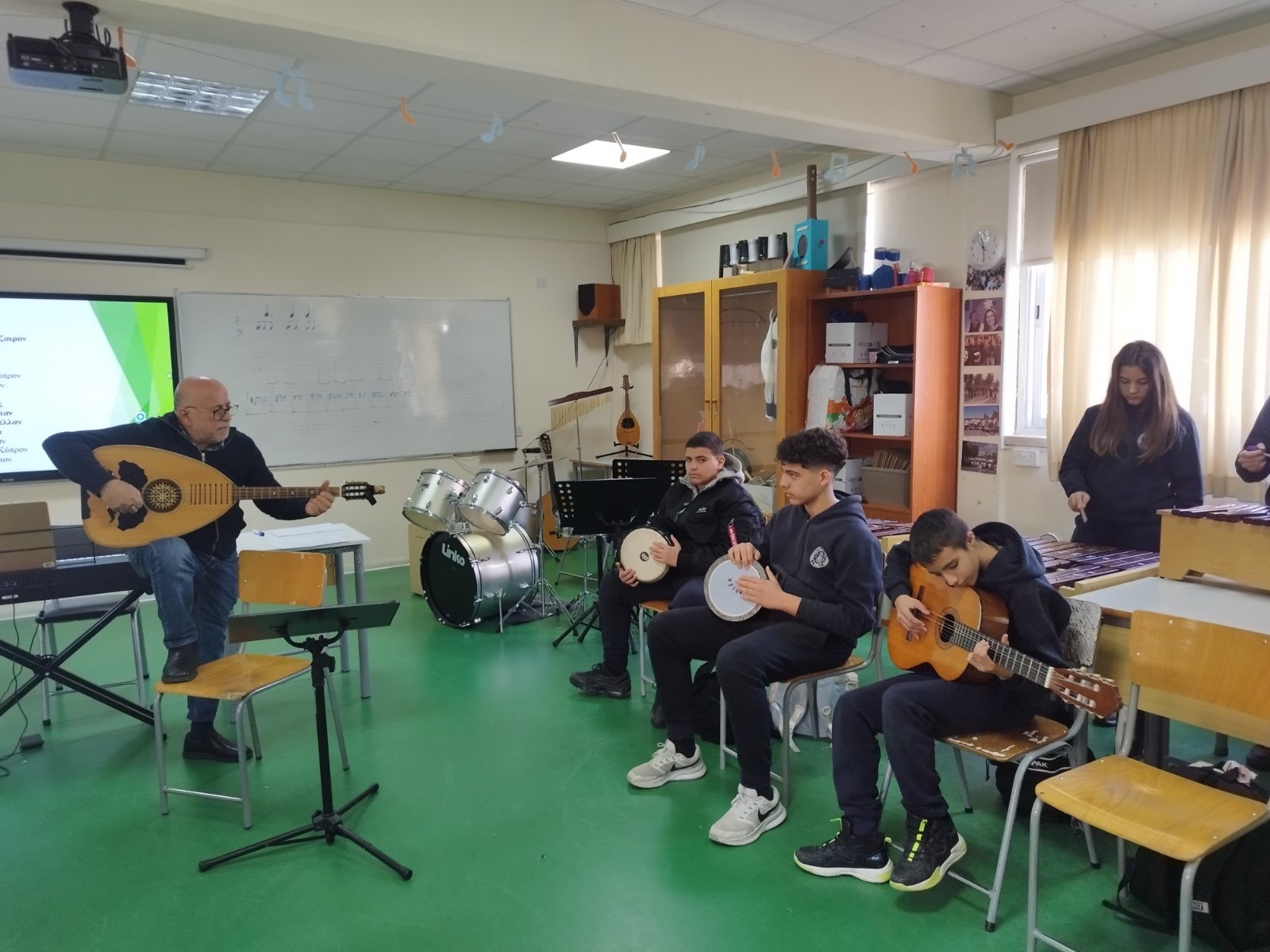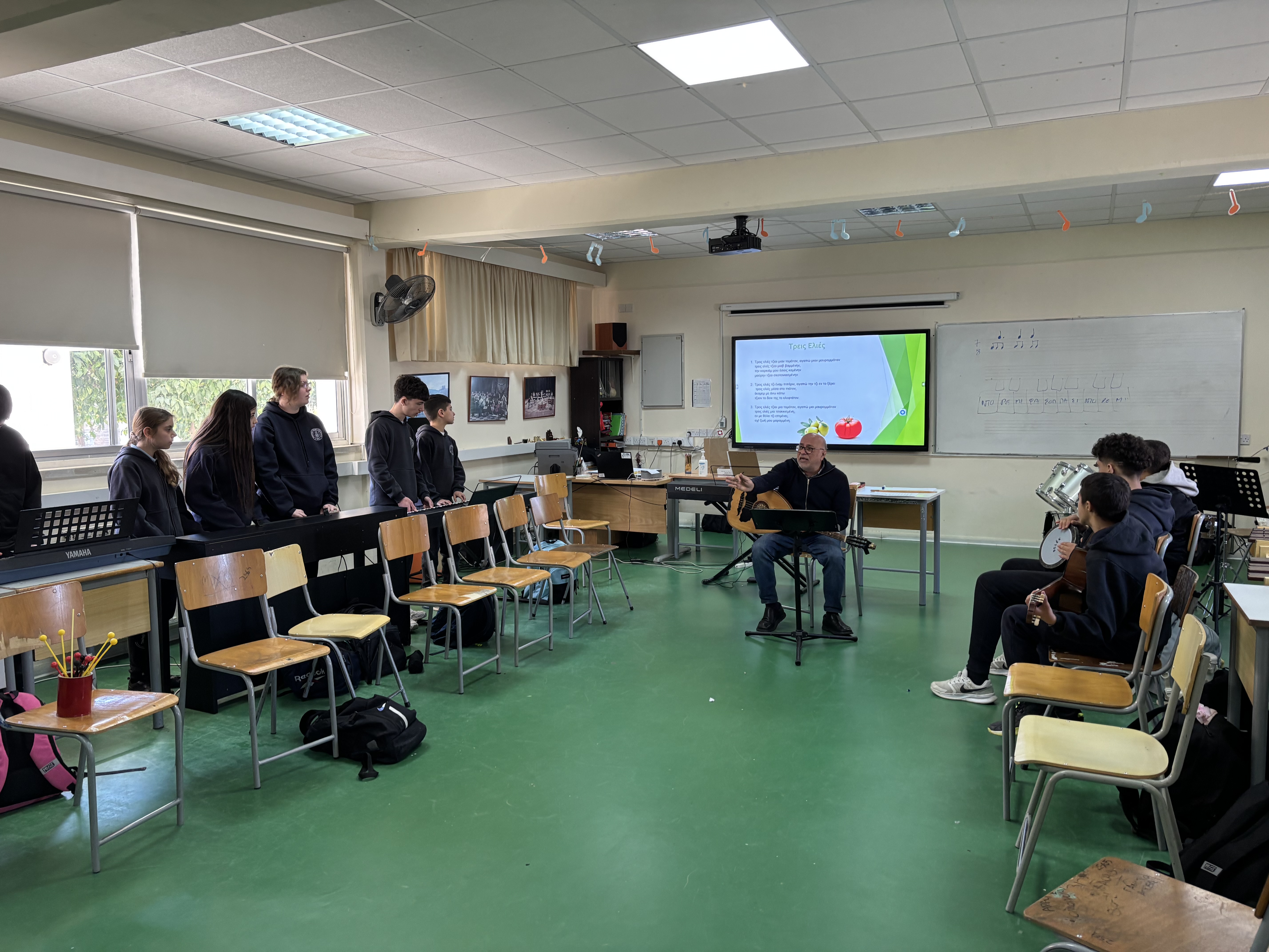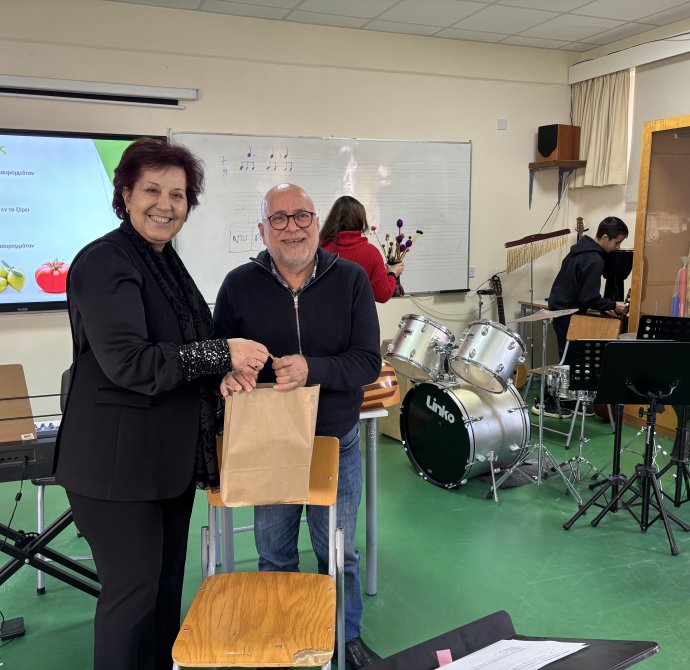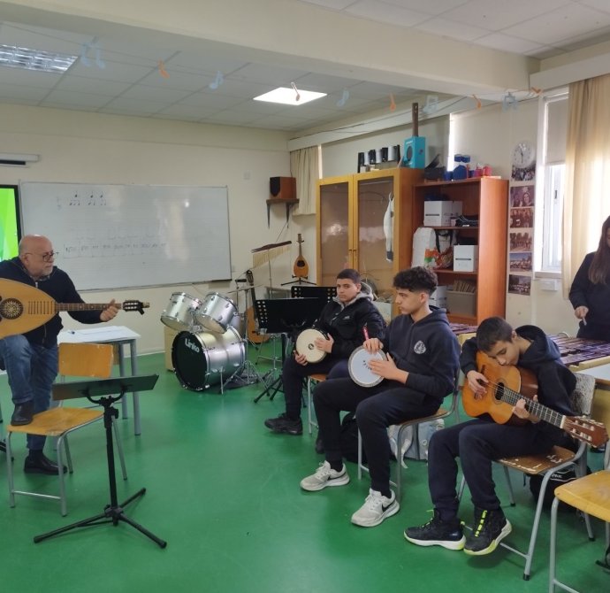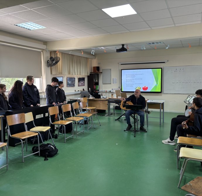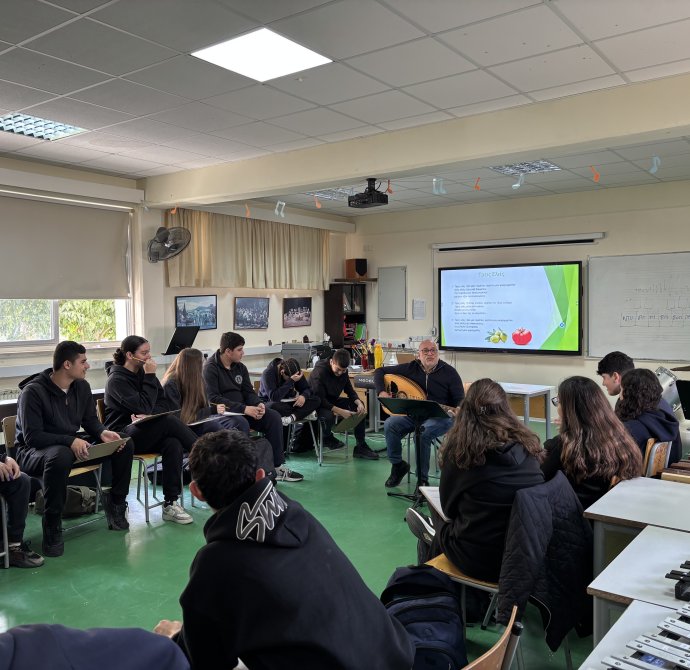 Τη Δευτέρα, 2 Μαρτίου 2026, στο πλαίσιο του μαθήματος της Μουσικής, μαθητές και μαθήτριες των τμημάτων Β1 και Β6 είχαν την ευκαιρία να παρακολουθήσουν μάθημα με θέμα «Η Κυπριακή Μουσική Παράδοση» το οποίο δίδαξε ο καταξιωμένος μουσικός, κ. Ευαγόρας Καραγιώργης. Η άμεση επαφή των παιδιών με τη μουσική παράδοση της Κύπρου αποτελεί σημαντικό στοιχείο της γνωριμίας τους με τον πολιτισμό του τόπου μας. Ιδιαίτερη αξία είχε το γεγονός ότι το μάθημα πραγματοποιήθηκε από έναν δημιουργό και συνθέτη που ασχολείται ενεργά με την κυπριακή μουσική, προσφέροντας στους/στις μαθητές/μαθήτριες αυθεντική και βιωματική εμπειρία μάθησης.
