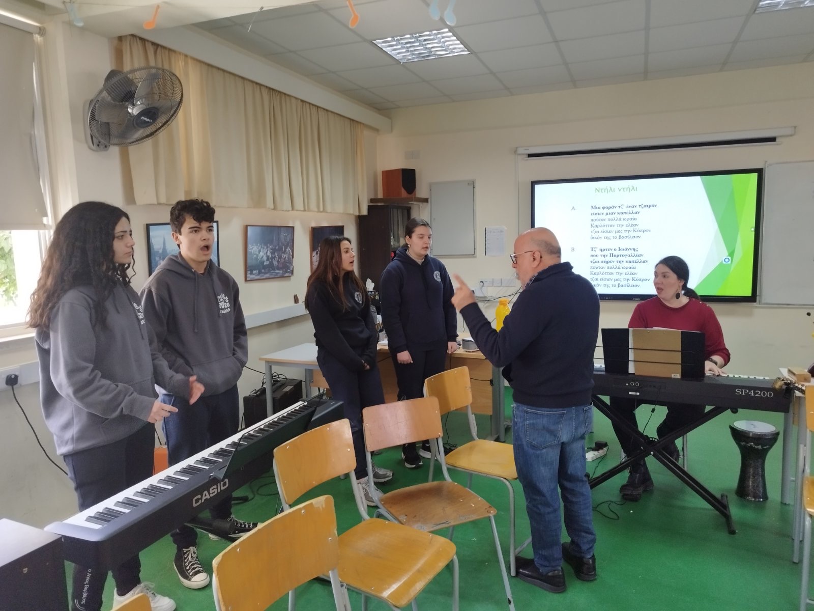 Επιπρόσθετα, μια μεγάλη έκπληξη περίμενε τα παιδιά του Φωνητικού Συνόλου του Σχολείου μας, τα οποία διδάσκονται την ερμηνεία του τραγουδιού «Τετράστιχο» σε μουσική του κ. Καραγιώργη. Ο κ. Καραγιώργης, παρευρέθηκε σε πρόβα τους, τα άκουσε τα και τα συμβούλεψε. Τον ευχαριστούμε, ιδιαίτερα, για την πολύτιμη προσφορά του.