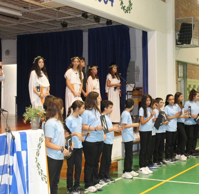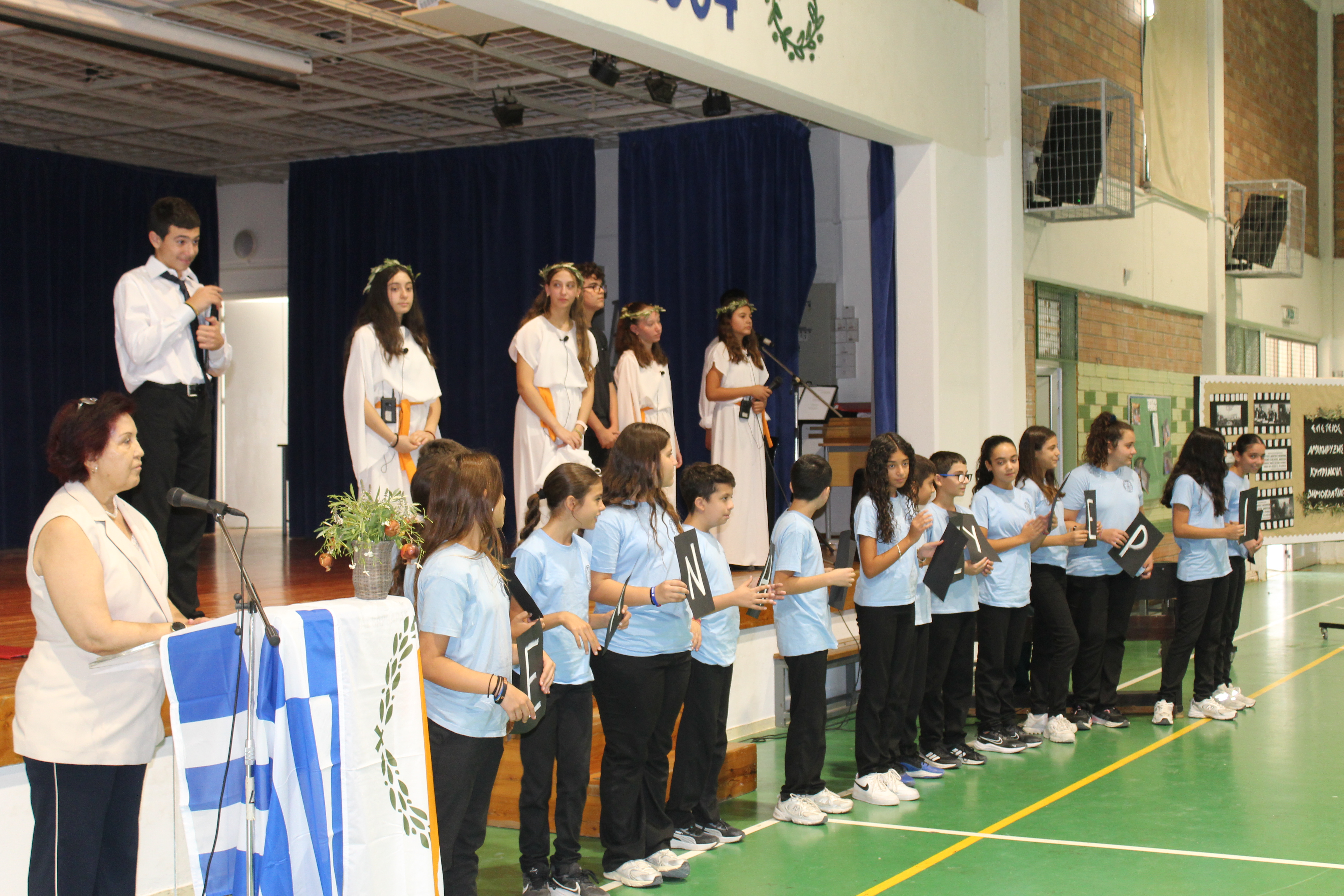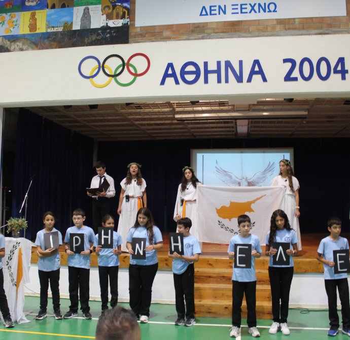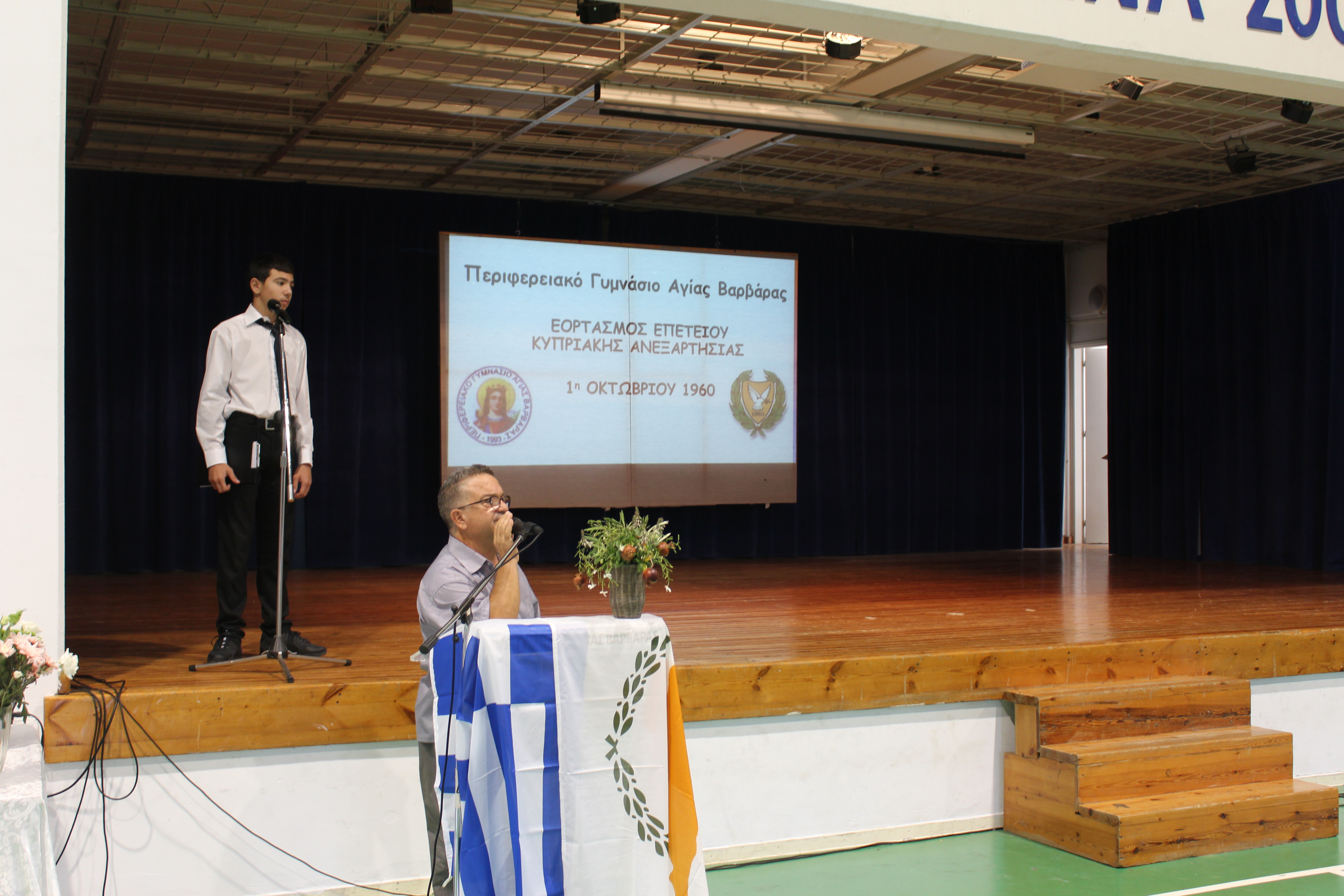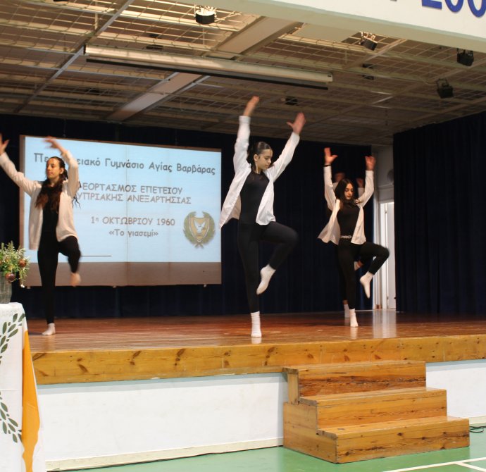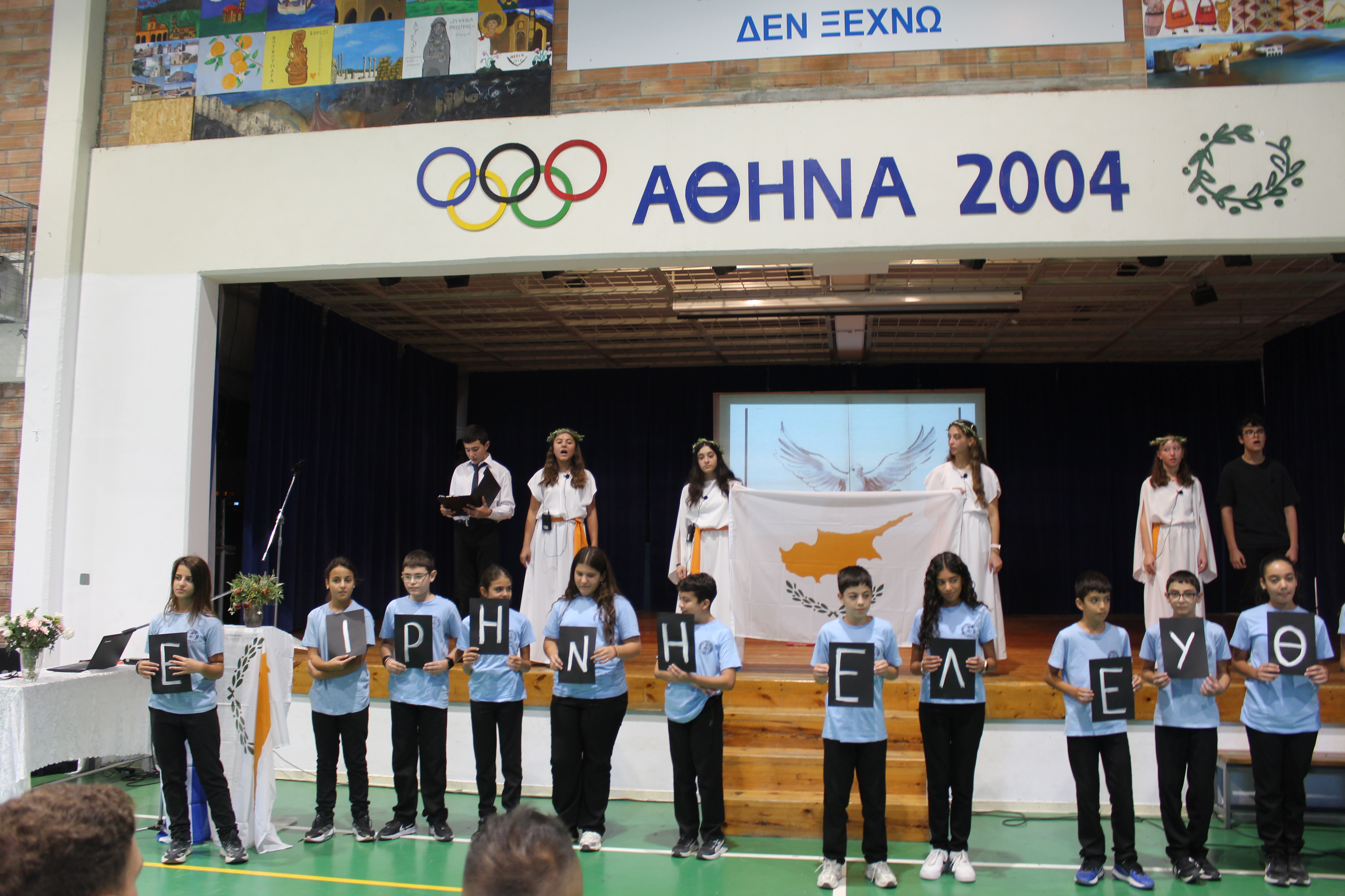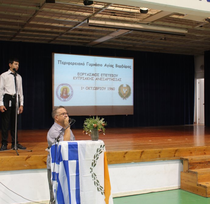Με αφορμή την επέτειο ανακήρυξης της Κυπριακής Δημοκρατίας, το σχολείο μας πραγματοποίησε εκδήλωση αφιερωμένη στην ιστορική διαδρομή της Κυπριακής Δημοκρατίας, στην πολιτισμική της ταυτότητα και στους αγώνες του λαού της για ειρήνη και δικαιοσύνη. Την εκδήλωση τίμησαν με την παρουσία τους ιερείς, αξιωματικοί των ενόπλων δυνάμεων των γειτονικών κοινοτήτων της Αγίας Βαρβάρας και του Μαθιάτη,η πρόεδρος και μέλη του Συνδέσμου Γονέων και Κηδεμόνων του σχολείου μας, γονείς και άλλοι εκλεκτοί προσκεκλημένοι.