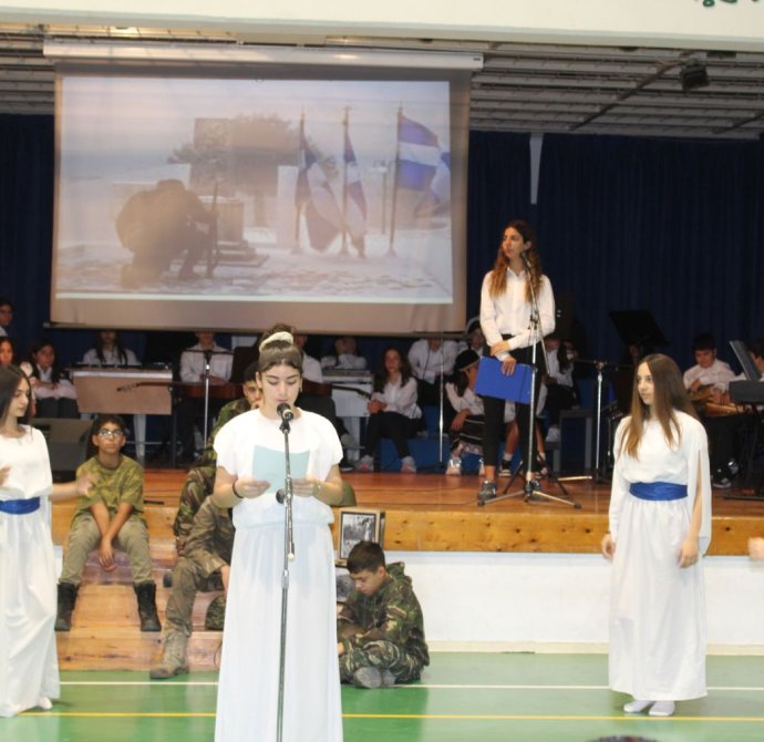 Στο πλαίσιο του εορτασμού της Εθνικής Επετείου της 28ης Οκτωβρίου και του εορτασμού της σημαίας, πραγματοποιήθηκε στο σχολείο μας μία συγκινητική εκδήλωση αφιερωμένη στους αγώνες του έθνους και τα εθνικά και κρατικά σύμβολα. Κατά τη διάρκεια της εκδήλωσης έγινε η Ανακήρυξη του Αγήματος και η παράδοση του Λαβάρου και των Σημαιών από τη Διευθύντρια του σχολείου κ. Ελένη Ιωάννου Λόρδου στη λαβαροφόρο του σχολείου, Παναγίδη Ευτύχια του Γ2 και τις σημαιοφόρους Μιχαήλ Άντρεα του Γ1 και Ζησίμου Άντρη του Γ7. Ακολούθως, οι μαθητές παρουσίασαν θεατρικά δρώμενα, ποιήματα, τραγούδια και χορούς αποδίδοντας φόρο τιμής στους ήρωες που αγωνίστηκαν για την ελευθερία και την αξιοπρέπεια της πατρίδας μας, αποτελώντας ευκαιρία για όλους να θυμηθούμε τις αξίες της ενότητας, της ειρήνης και της δημοκρατίας. Την εκδήλωση τίμησαν με την παρουσία τους κοινοτάρχες, ιερείς, μέλη του συνδέσμου γονέων, γονείς και άλλοι εκλεκτοί προσκεκλημένοι.
