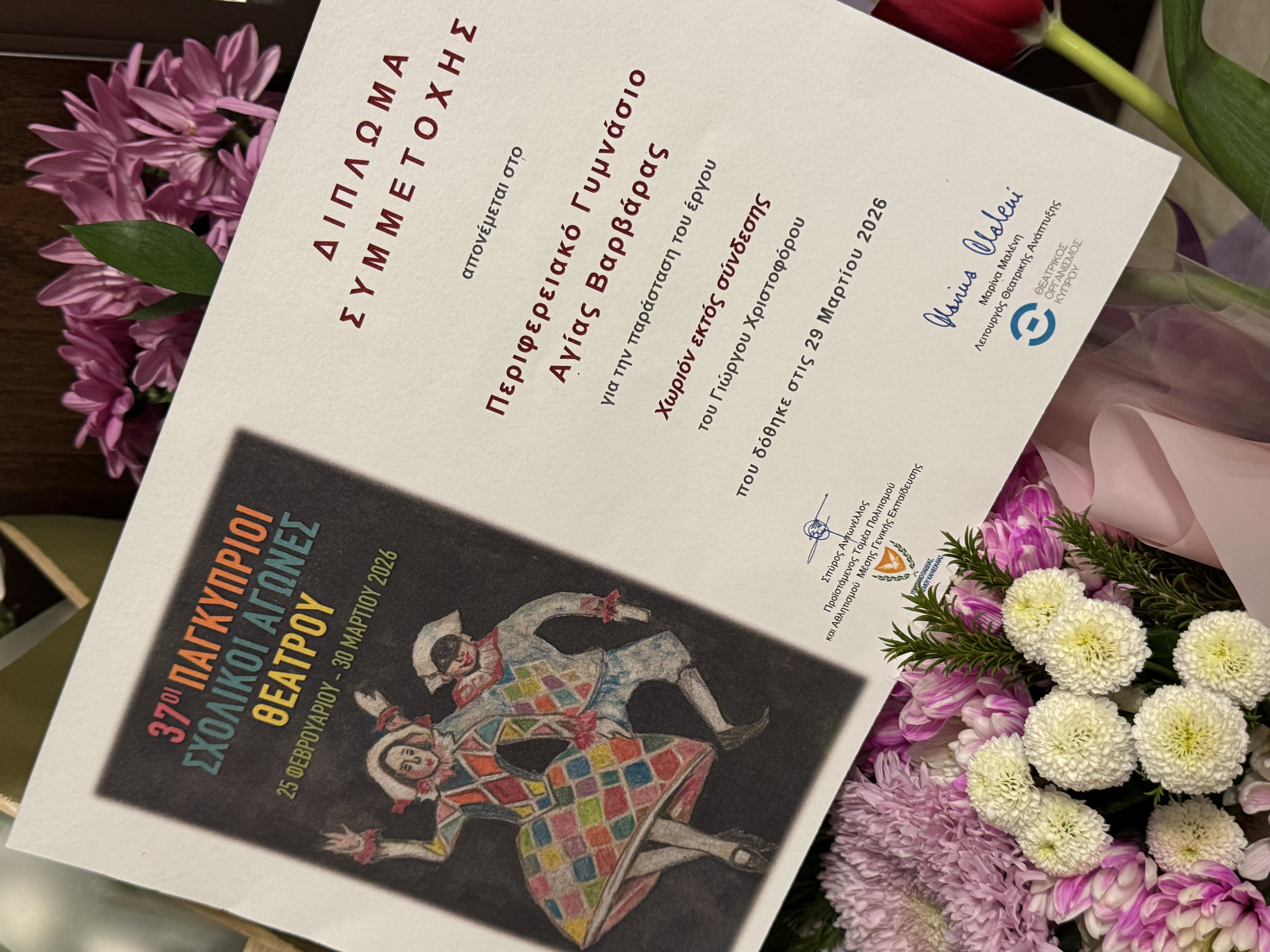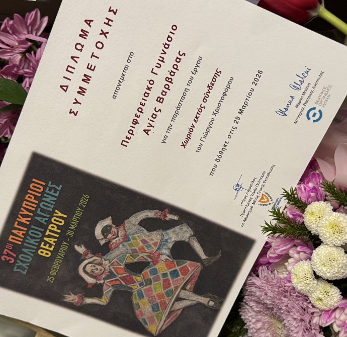 Η θεατρική ομάδα του Περιφερειακού Γυμνασίου Αγίας Βαρβάρας συμμετείχε με ιδιαίτερη επιτυχία στους 37ους Παγκύπριους Σχολικούς Αγώνες Θεάτρου, παρουσιάζοντας το πρωτότυπο έργο «Χωριόν εκτός Σύνδεσης», το οποίο απέσπασε το 2ο Βραβείο στην κατηγορία Γυμνασίων της επαρχίας Λευκωσίας. Ιδιαίτερη καινοτομία της φετινής συμμετοχής αποτέλεσε το γεγονός ότι το έργο γράφτηκε από τον 15χρονο μαθητή του σχολείου μας Γιώργο Χριστοφόρου, αναδεικνύοντας τη δύναμη της μαθητικής δημιουργικότητας. Μέσα από μια σύγχρονη κωμωδία, γραμμένη στην κυπριακή διάλεκτο, το έργο καυτηριάζει με χιούμορ την εξάρτηση από την τεχνολογία και αναδεικνύει τη σημασία της ανθρώπινης επικοινωνίας. Η παράσταση συγκίνησε και ενθουσίασε το κοινό, ενώ παράλληλα ανέδειξε τη σύνδεση της κυπριακής διαλέκτου με την αρχαία ελληνική γλώσσα. Η επιτυχία αυτή αποτελεί καρπό συλλογικής προσπάθειας, δημιουργικής έκφρασης και αγάπης για το θέατρο, κάνοντάς μας όλους ιδιαίτερα περήφανους.