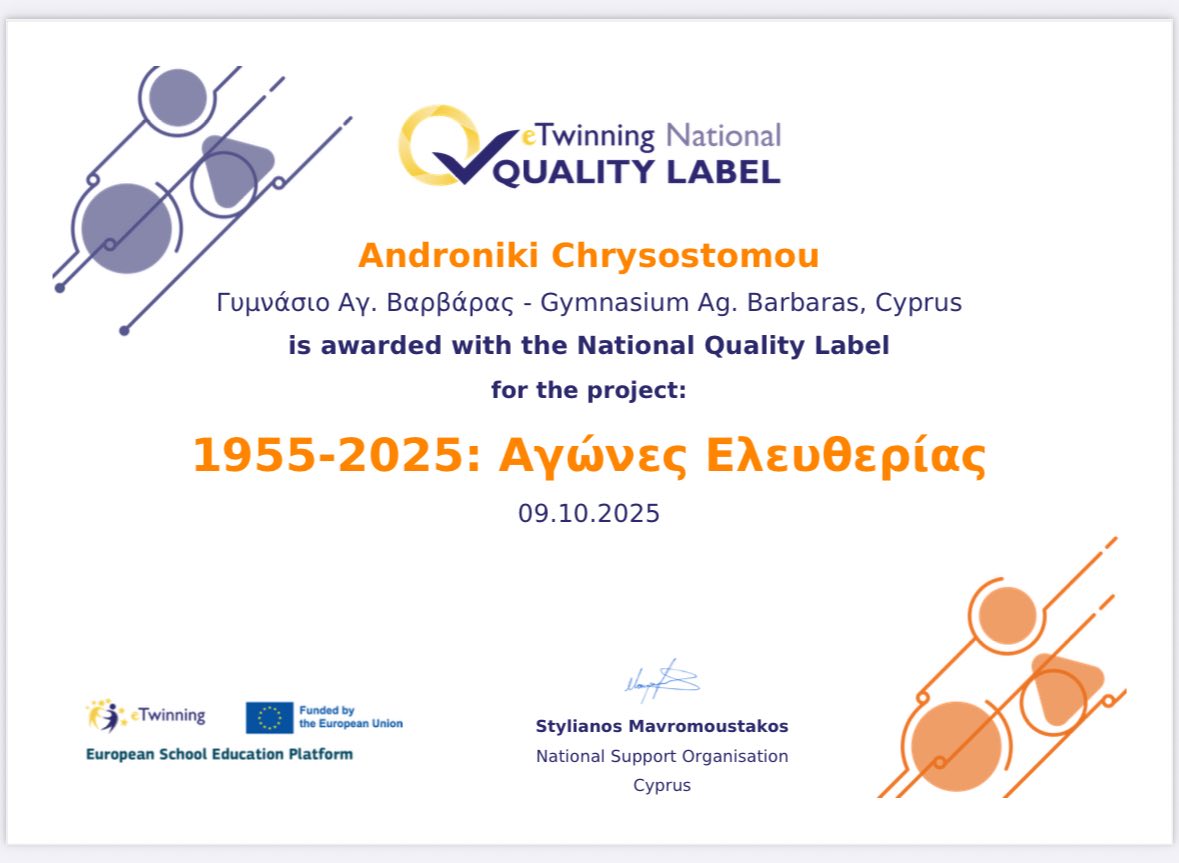 Στο έργο συμμετείχαν 13 μαθητές από το σχολείο μας, σε συνεργασία με άλλα 6 σχολεία από την Ελλάδα και την Κύπρο. Το πρόγραμμα συντόνισαν οι κ. Ανδρονίκη Χρυσοστόμου και κ. Αγγέλα Μιχαήλ, φιλόλογοι του σχολείου μας. Μέσα από ιστορική έρευνα, συζητήσεις και δημιουργικές παρουσιάσεις, οι μαθητές ανέδειξαν τη διαχρονική αξία του Αγώνα της Κύπρου για ελευθερία, ανεξαρτησία και δημοκρατία.