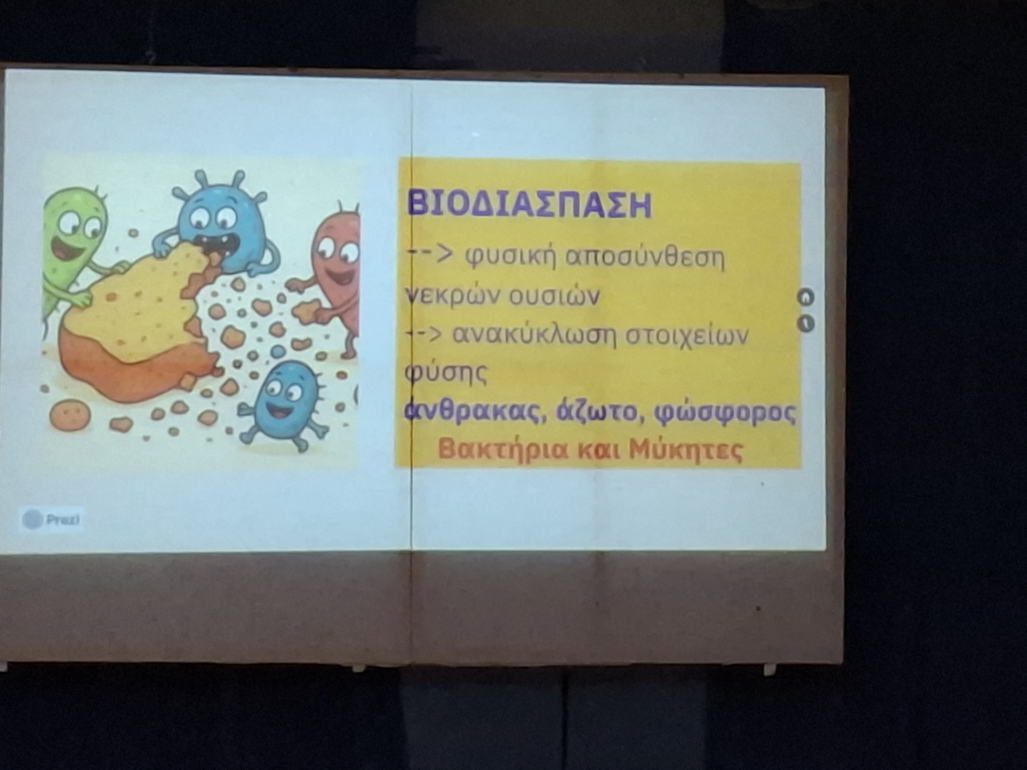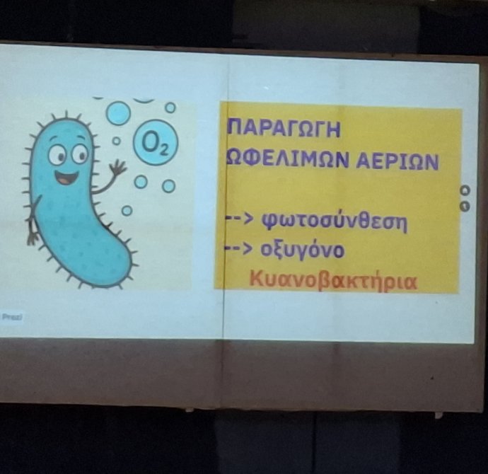 Στο περιβάλλον, τα βακτήρια και οι μύκητες διασπούν οργανική ύλη, ανακυκλώνουν θρεπτικά στοιχεία και συμβάλλουν στη γονιμότητα του εδάφους και στη διατήρηση της ισορροπίας των οικοσυστημάτων. Στα τρόφιμα, οι μικροοργανισμοί είναι υπεύθυνοι για την παραγωγή αγαπημένων προϊόντων όπως το ψωμί, το γιαούρτι, το τυρί, το κρασί και τα τουρσιά, μέσω διαδικασιών ζύμωσης που οι άνθρωποι αξιοποιούν εδώ και χιλιάδες χρόνια. Επίσης, μου έκανε ιδιαίτερη εντύπωση η έρευνα της ομιλήτριας σύμφωνα με την οποία συγκεκριμένα Γεωβακτήρια (Θειοαναγωγικό Γεωβακτήριο) μπορούν κάτω από κατάλληλες συνθήκες να παράξουν ηλεκτρισμό. Επίσης, είπαμε για κάποια που καθαρίζουν το περιβάλλον από τοξικές ουσίες π.χ. Δεχλωρόσωμα σουίλλουμ (Dehalococcoides suillum).
