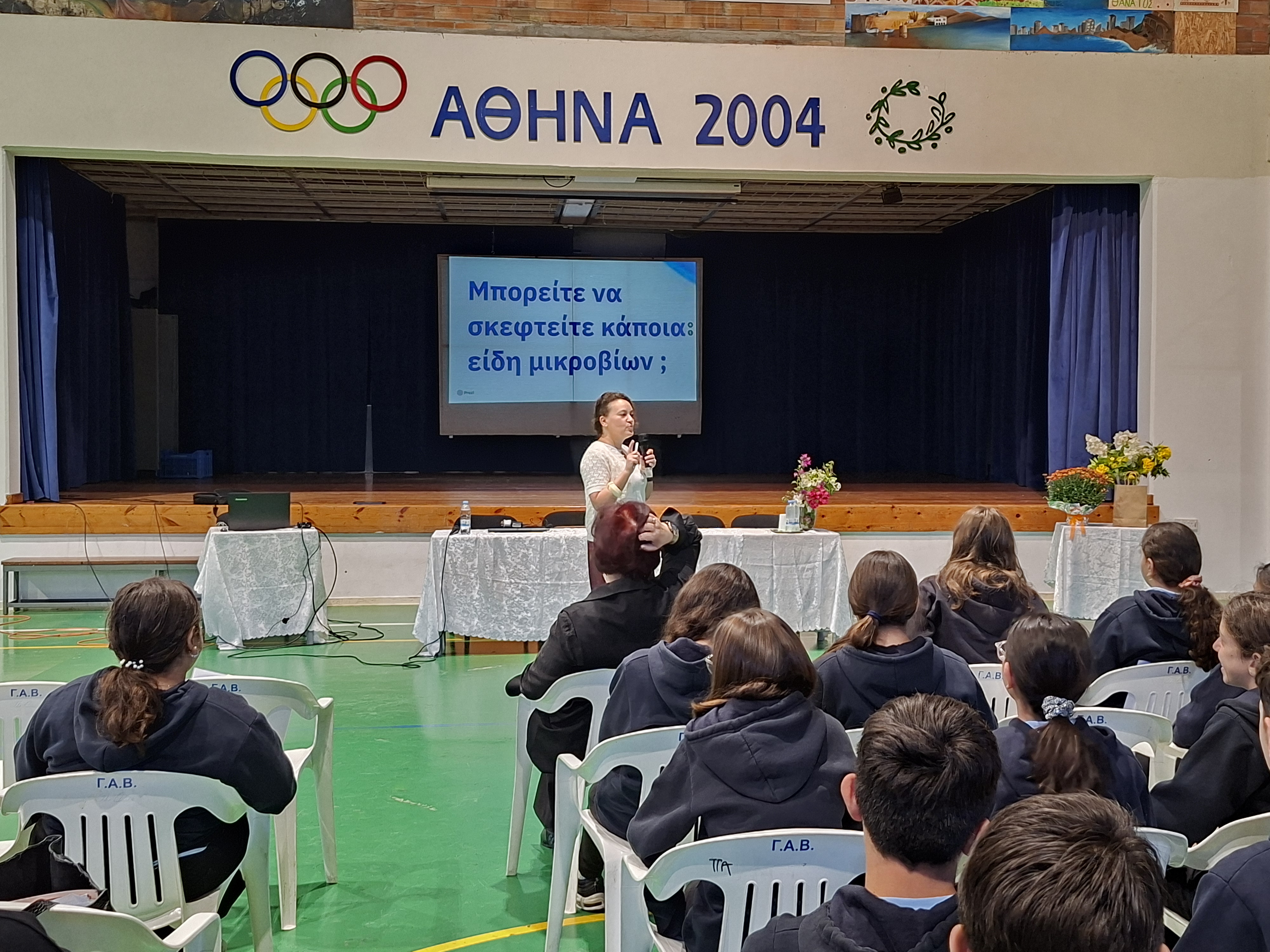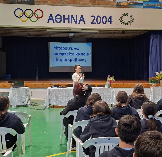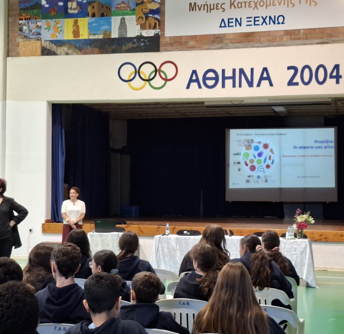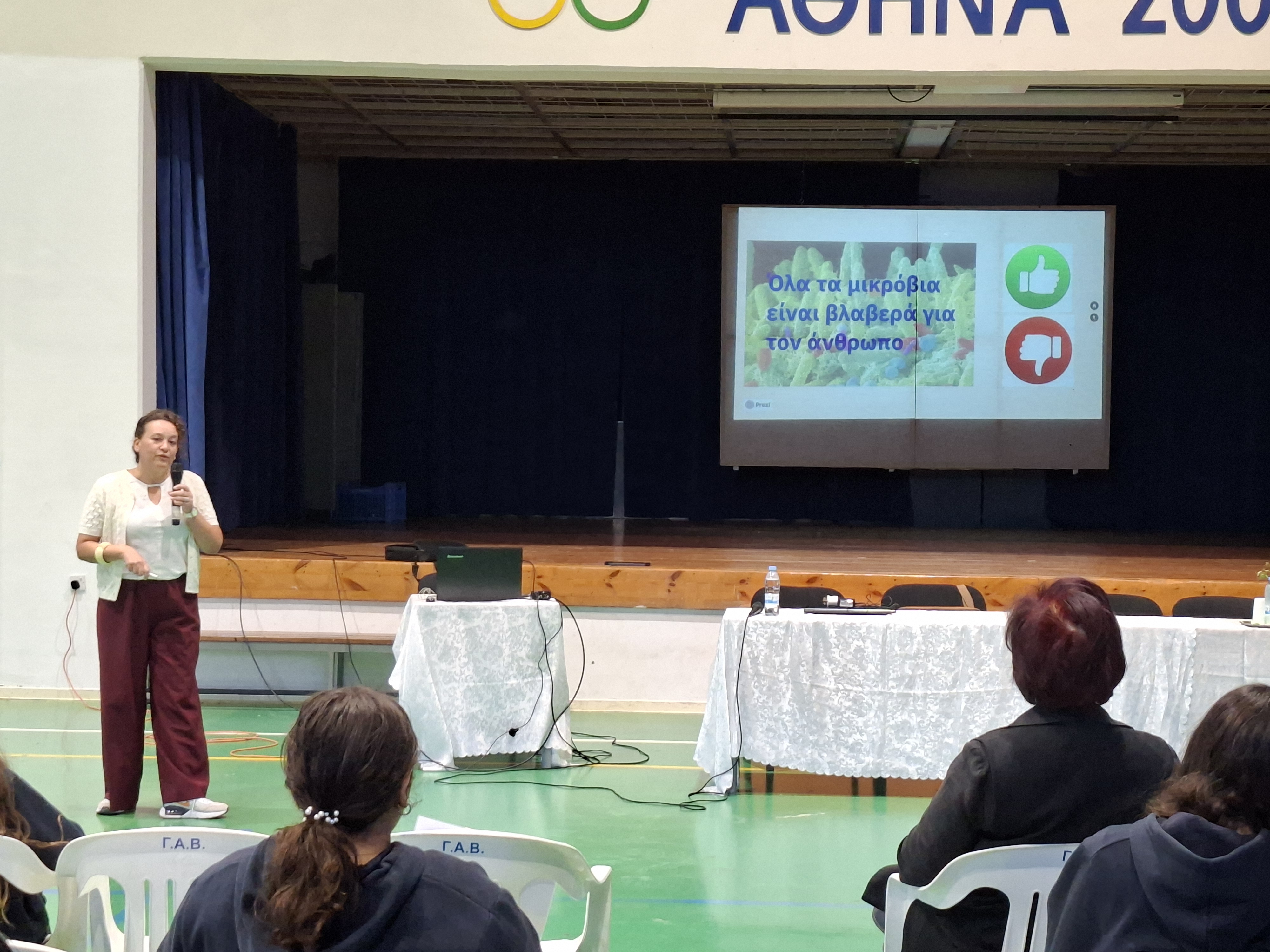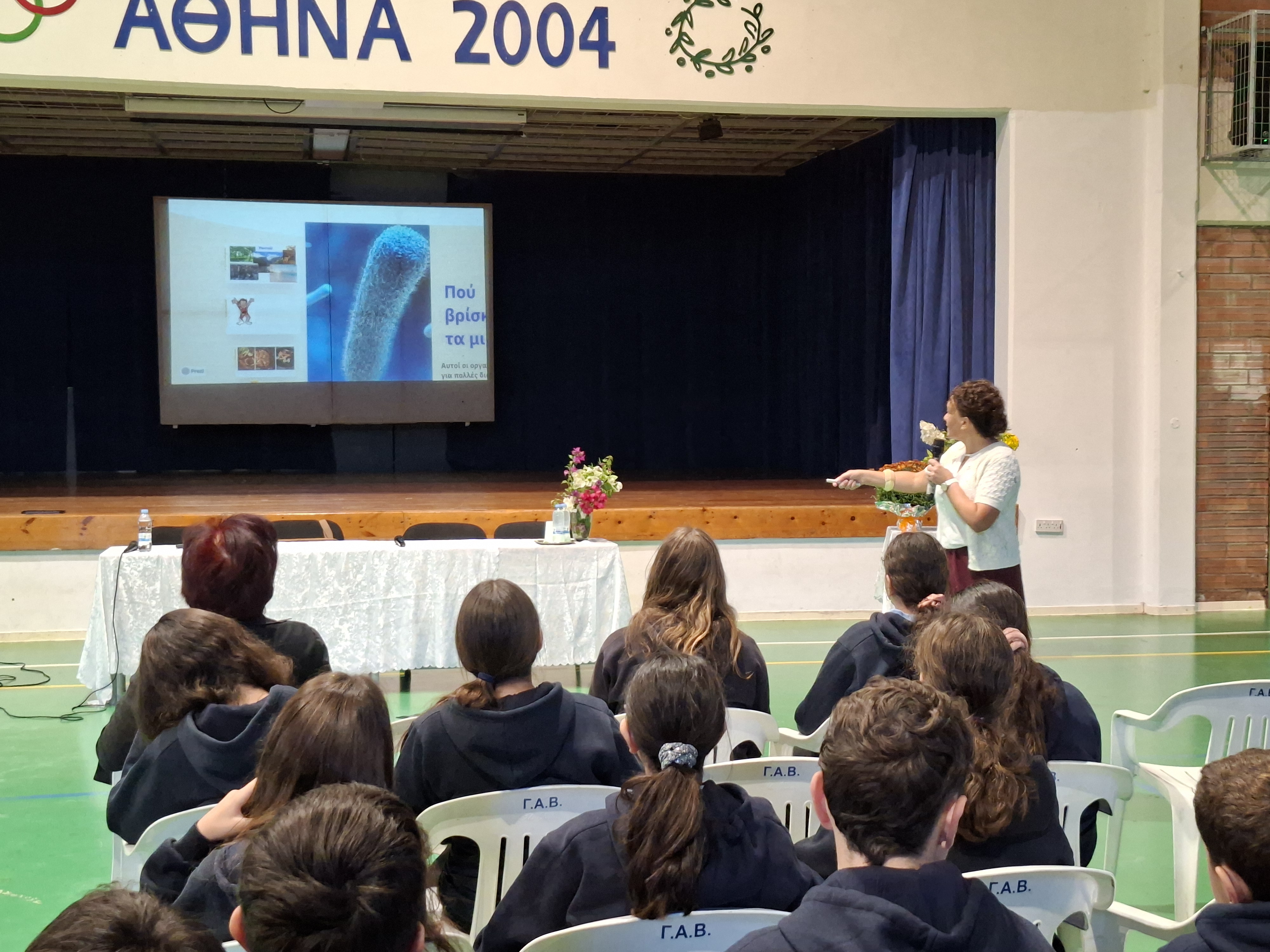 Είχαμε τη χαρά να φιλοξενήσουμε στο σχολείο μας τη Δρ. Ουρανία Μιχαηλίδου, η οποία παρουσίασε σε όλα τα παιδιά της Α’ τάξης Γυμνασίου το πολύ ενδιαφέρον θέμα «Οι αόρατοι φίλοι μας» εστιάζοντας ιδιαίτερα στα χρήσιμα βακτήρια που υπάρχουν γύρω και στον οργανισμό μας π.χ. Σταφυλόκοκκος επιδερμίδις (Staphylococcus epidermidis) ο οποίος προστατεύει το δέρμα, τα Μπιφιδοβακτήρια που βοηθούν το πεπτικό σύστημα, οι Οινόκοκκοι και Σακχαρομύκητες που βοηθούν στις ζυμώσεις και παραγωγή οίνου και μπύρας.