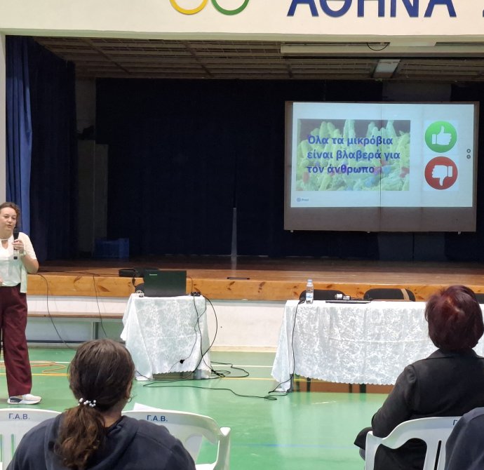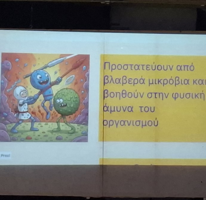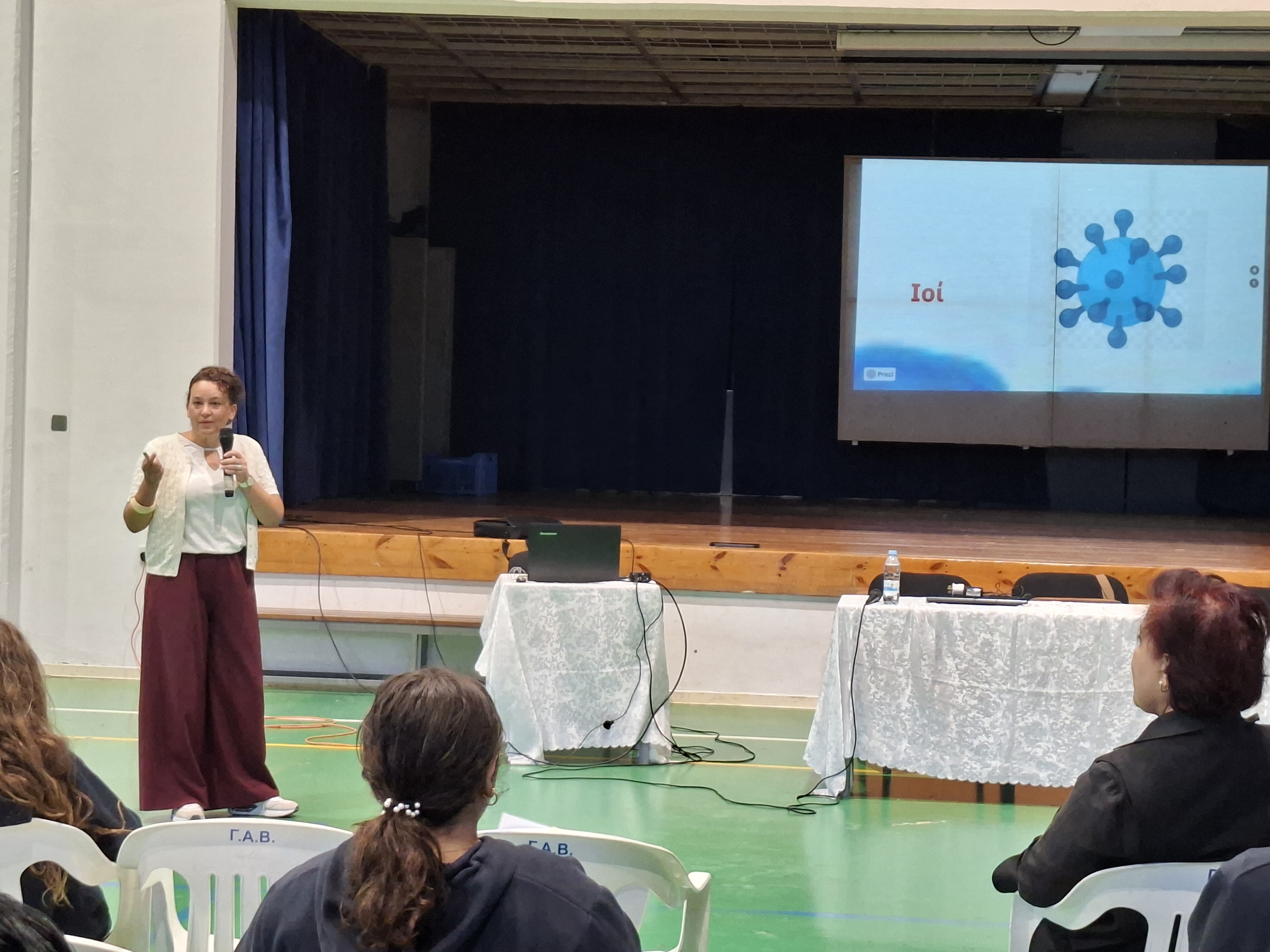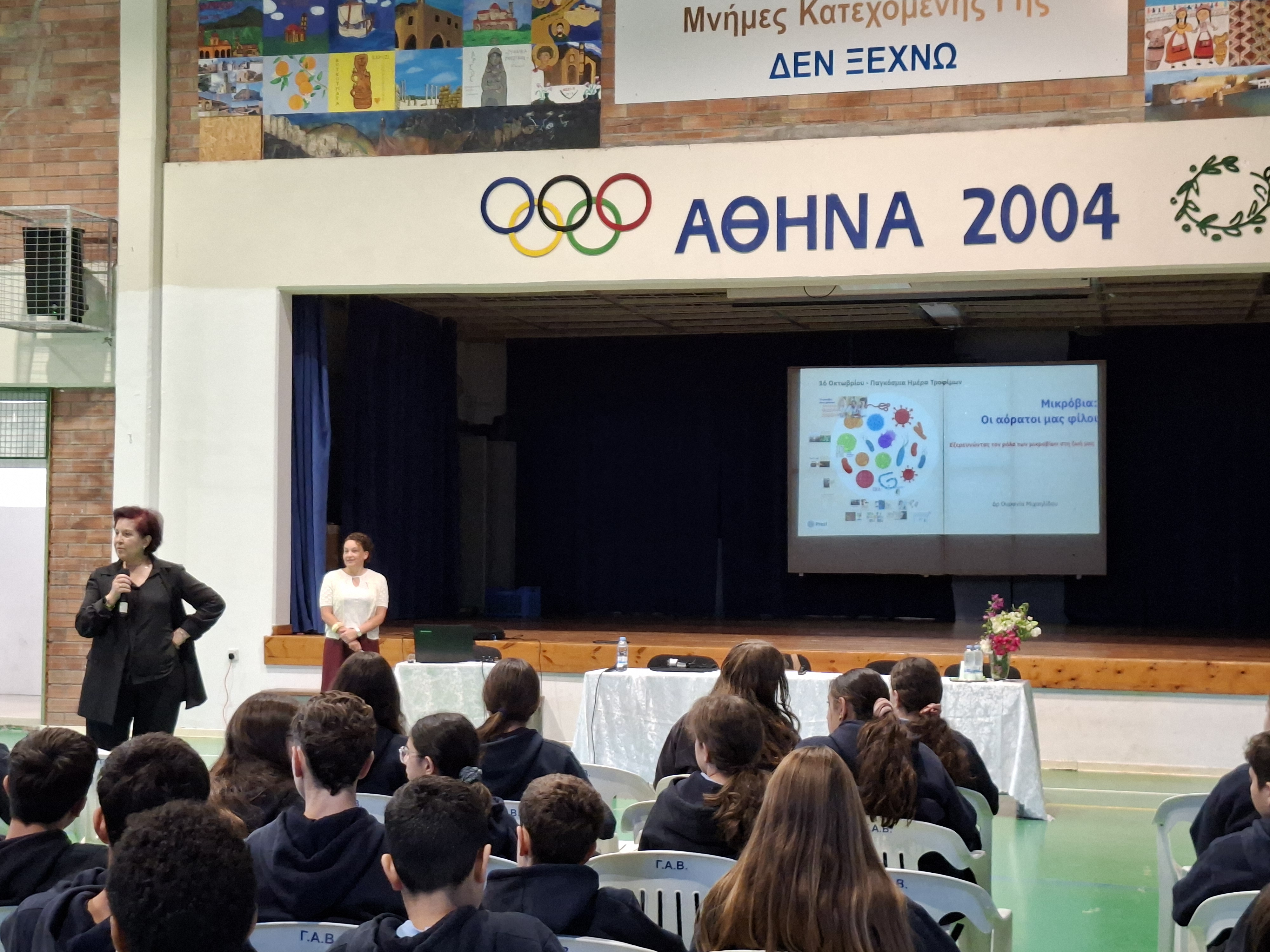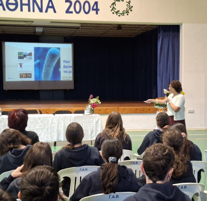Είχαμε τη χαρά να φιλοξενήσουμε στο σχολείο μας τη Δρ. Ουρανία Μιχαηλίδου, η οποία παρουσίασε σε όλα τα παιδιά της Α’ τάξης Γυμνασίου το πολύ ενδιαφέρον θέμα «Οι αόρατοι φίλοι μας» εστιάζοντας ιδιαίτερα στα χρήσιμα βακτήρια που υπάρχουν γύρω και στον οργανισμό μας π.χ. Σταφυλόκοκκος επιδερμίδις (Staphylococcus epidermidis) ο οποίος προστατεύει το δέρμα, τα Μπιφιδοβακτήρια που βοηθούν το πεπτικό σύστημα, οι Οινόκοκκοι και Σακχαρομύκητες που βοηθούν στις ζυμώσεις και παραγωγή οίνου και μπύρας.
