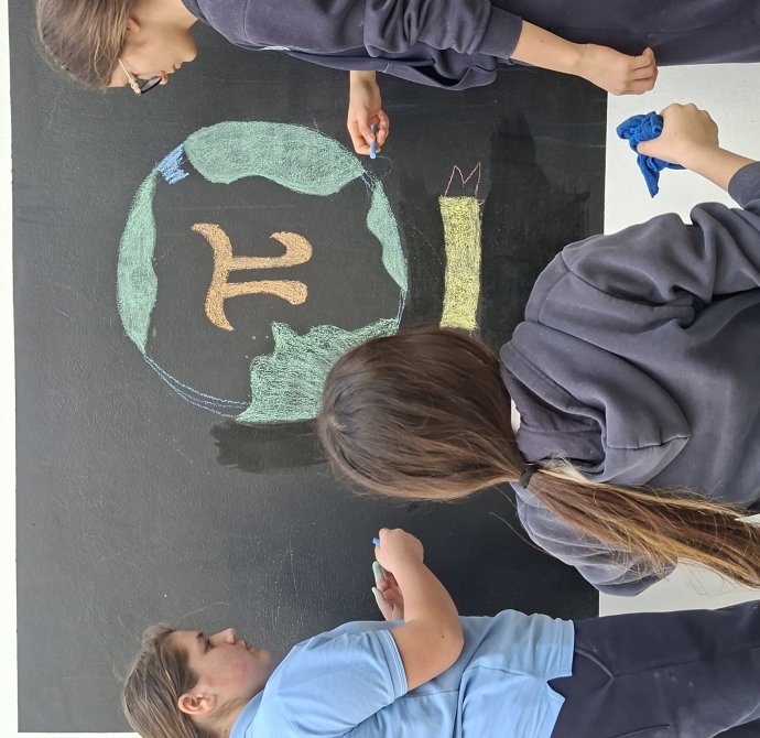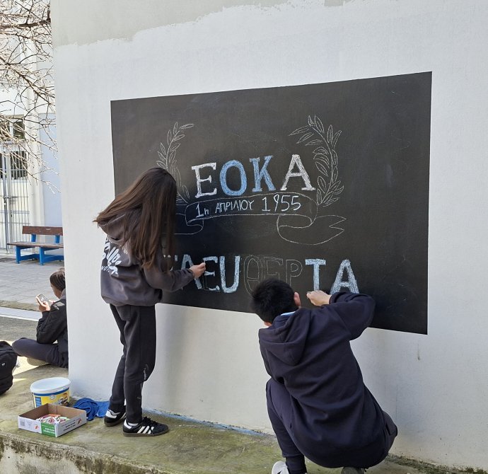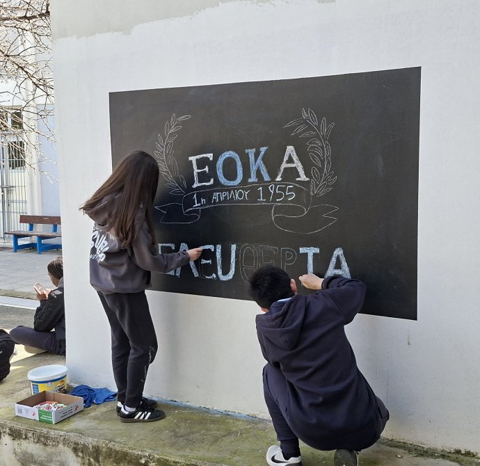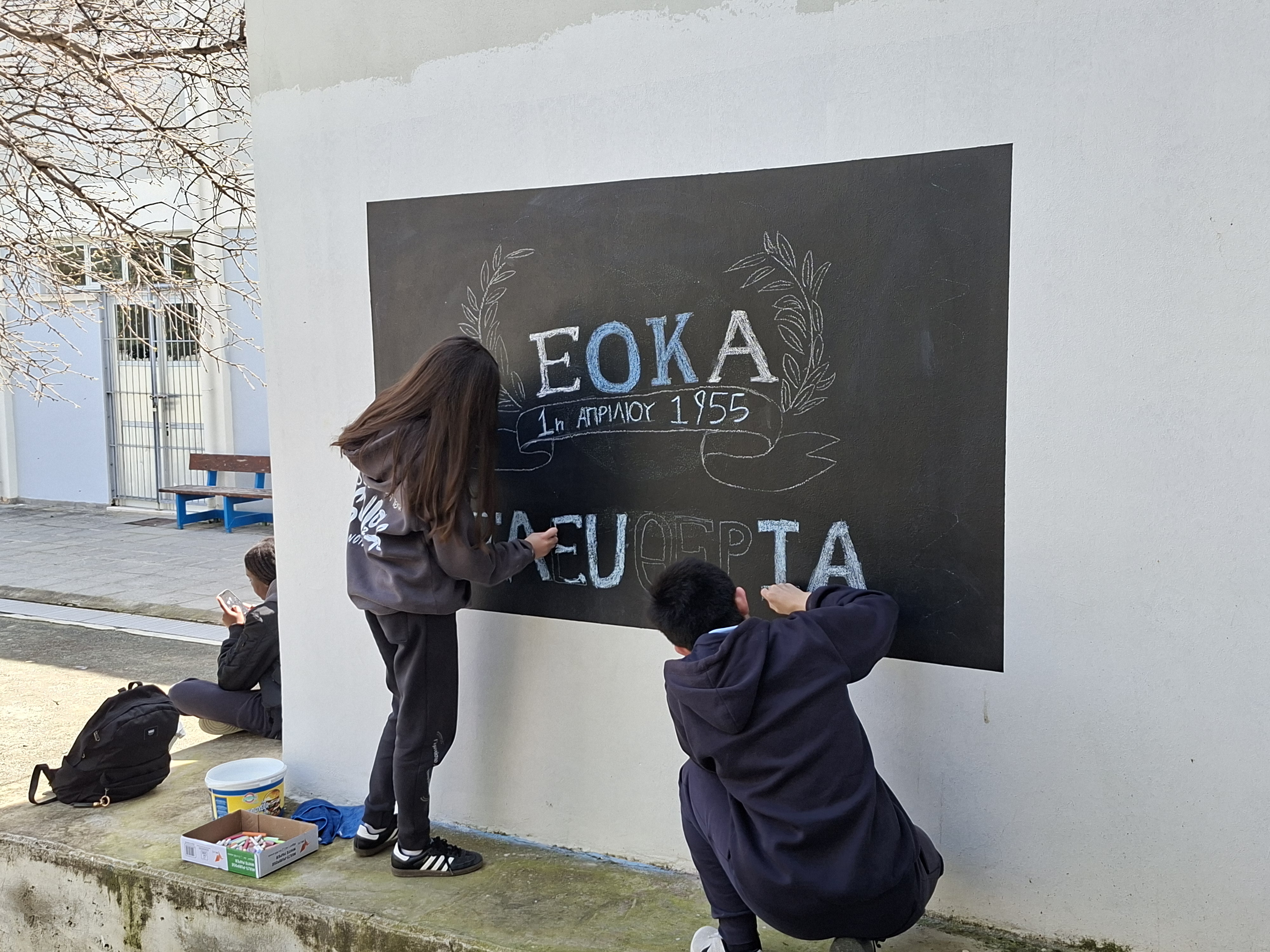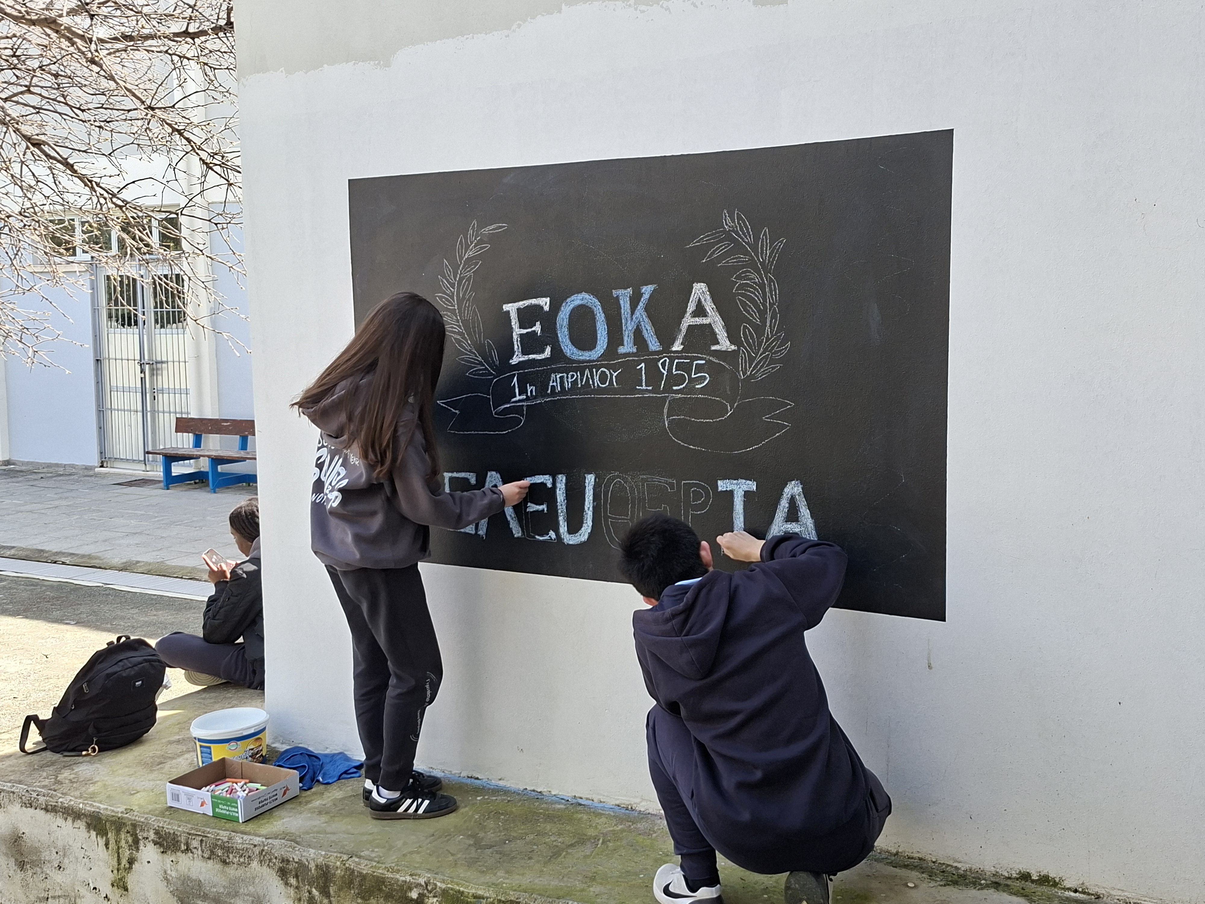 Στο πλαίσιο των στόχων της φετινής χρονιάς, έχει δημιουργηθεί ένας «μαυροπίνακας» στον βόρειο τοίχο του ανελκυστήρα, ο οποίος προορίζεται για τη δημιουργική έκφραση των μαθητών μας. Τα παιδιά μπορούν να αποτυπώνουν με κιμωλία τις σκέψεις τους για τα κατεχόμενα εδάφη μας, περιβαλλοντικές ανησυχίες, συμβουλές κοινωνικής ευθύνης, καθώς και οτιδήποτε άλλο τους απασχολεί.