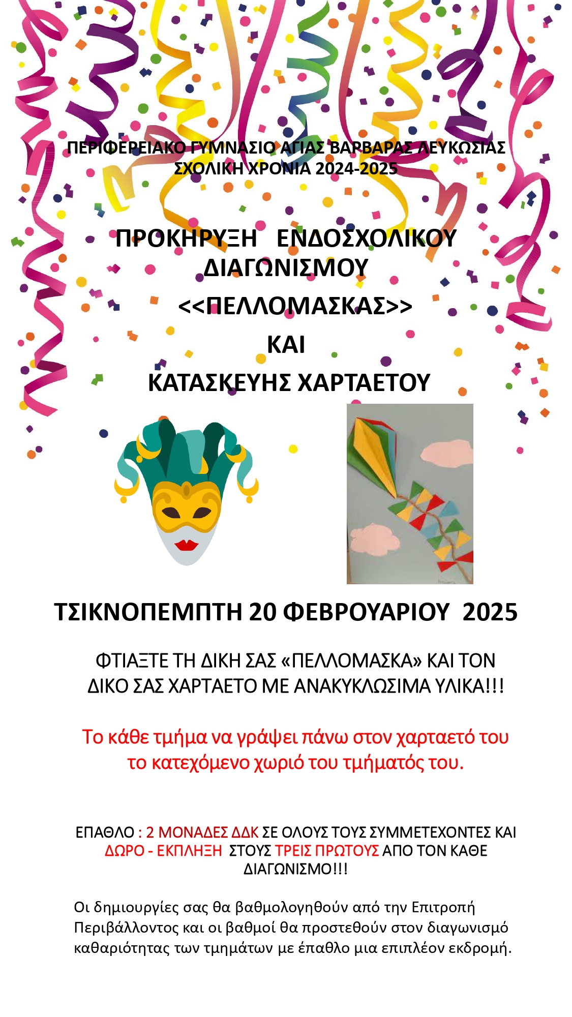 Στο πλαίσιο των δραστηριοτήτων μας σε συνεργασία με τα άλλα περιβαλλοντικά προγράμματα του σχολείου και παράλληλα με τους στόχους της χρονιάς, την ημέρα της Τσικνοπέμπτης, 20 Φεβρουαρίου 2025, προχωρήσαμε σε ενδοσχολικό διαγωνισμό κατασκευής «πελλόμασκας» και χαρταετού με ανακυκλώσιμα υλικά, όπως εφημερίδες, παλιά χαρτιά και ρούχα. Στόχος μας ήταν να συνδυάσουμε τη χαρά της δημιουργίας με την περιβαλλοντική συνείδηση και την ενίσχυση της ιστορικής – πολιτιστικής μνήμης. Συνεχίζοντας τις δράσεις του Σχολείου για τα 50 χρόνια Εισβολής και Κατοχής ομαδικά ως τμήμα είτε ατομικά οι μαθητές μας κατασκεύασαν χαρταετούς όπου ο καθένας δήλωνε μια κατεχόμενη περιοχή ή το κατεχόμενο χωριό σύμφωνα με το όνομα του τμήματός τους. Με αυτό τον τρόπο, τιμήσαμε την ιστορία και τις παραδόσεις μας, πετώντας τους χαρταετούς μας ως σύμβολο της ελπίδας και της ελευθερίας!