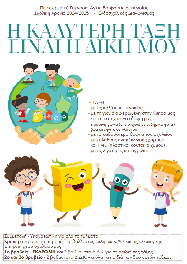 Μέσα στα πλαίσια του Προγράμματος «Οικολογικά Σχολεία» εμπίπτει και το Πρόγραμμα Net Zero 4 Youth (NZ4Y). Ένα Πρόγραμμα που στηρίζεται από τη CYMEPA (Εθνικός Χειριστής του Προγράμματος), το Υπουργείο Παιδείας με την Επιθεώρηση της Βιολογίας, την Επίτροπο Περιβάλλοντος, τον Οργανισμό Νεολαίας Κύπρου και επιχορηγείται από την Ελληνική Τράπεζα. Σκοπός του NZ4Y είναι η ενίσχυση της περιβαλλοντικής συνείδησης προς έναν πιο φιλικό προς το περιβάλλον τρόπο ζωής, συμβάλλοντας ενεργά στη μετάβαση για ένα βιώσιμο μέλλον. Κατά τη φετινή χρονιά το Πρόγραμμα NZ4Y συνέχισε τη δράση «Ο μαγικός κόσμος της καλλιέργειας» όπου τα παιδιά με την καθοδήγηση των εκπαιδευτικών τους καλλιέργησαν και μελέτησαν διάφορα βότανα. Ταυτόχρονα σχεδιάστηκε σχετική ιστοσελίδα για καταγραφή δραστηριοτήτων και ενεργειών των μαθητών οι οποίες έχουν άμεση ή έμμεση επίδραση στη κλιματική αλλαγή και στις συνέπειες των ανθρωπογενών δράσεων στο περιβάλλον. Το NZ4Y συνδυάζει τη γνώση με τη βιωματική εμπειρία προσφέροντας στους μαθητές ευκαιρίες να προσεγγίσουν περιβαλλοντικά ζητήματα με τρόπο δημιουργικό και πρακτικό. Μέσα από διαγωνισμούς με ερωτηματολόγια, δραστηριότητες και απλές πρακτικές, όπως η φύτευση των μοσχευμάτων και σπόρων, τα παιδιά έρχονται σε επαφή με τον φυτικό κύκλο ζωής και συνδέουν τη θεωρία με την καθημερινότητα. Την Πέμπτη, 19 Ιουνίου 2025, βραβεύτηκαν τα σχολεία τα οποία συμμετείχαν καθώς και παιδιά τα οποία διακρίθηκαν μέσα από τις δραστηριότητες του προγράμματος NZ4Y. Από τα 46 Οικολογικά Δημόσια Σχολεία Μ.Ε. που έλαβαν μέρος, το Σχολείο μας διακρίθηκε ως ένα από τα 10 σχολεία με την καλύτερη συνολική απόδοση στις δραστηριότητες του Προγράμματος NZ4Y και πήρε το βραβείο «Συνολικής Απόδοσης Σχολείου NZ4Y 2024-2025». Το δώρο του Σχολείου μας ήταν ένας κομποστοποιητής και ένα κουτί «Compost Stimulator” – ενεργοποιητής κομποστοποίησης. Δύο μαθήτριες μας, η Ελένη Φιλίππου του Γ1 και η Έλενα Ηλία του Γ3 πήραν βραβείο «Εξαιρετικής Επίδοσης NZ4Y 2024-2025» ως αναγνώριση διαχρονικής συμμετοχής, επίτευξης άριστης βαθμολογίας στα κουίζ και συγκέντρωση άνω των 1000 πόντων. Οι μαθήτριες πήραν διάφορα δώρα όπως: φανέλες, καπελάκια και γυαλιά ηλίου. Επίσης, η μαθήτρια μας Εβελίνα Νικολάου του Α1 πήρε βραβείο «Ημέρας Δράσης» που έγινε στις 29/03/2025 στο πάρκο Αθαλάσσας και το δώρο της ένα τριήμερο σεμινάριο: GT AI Bootcamp – με τίτλο «Πως η Τεχνητή Νοημοσύνη αλλάζει τον κόσμο μας».