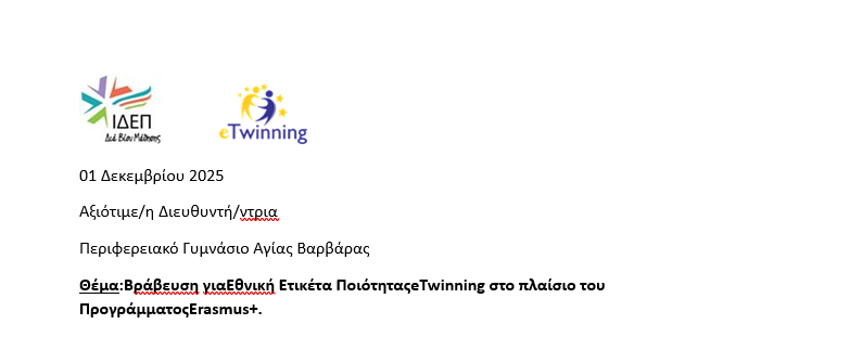 Bράβευση γιαΕθνική Ετικέτα ΠοιότηταςeTwinning στο πλαίσιο του ΠρογράμματοςErasmus+. Bράβευση γιαΕθνική Ετικέτα ΠοιότηταςeTwinning στο πλαίσιο του ΠρογράμματοςErasmus+. Διαβάστε περισσότερα επιλέγοντας εδώ.. ...