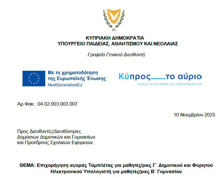 Επιχορήγηση αγοράς Ταμπλέτας για μαθητές/ριες Γ΄ Δημοτικού και Φορητού Ηλεκτρονικού Υπολογιστή για μαθητές/ριες Β΄ Γυμνασίου Επιχορήγηση αγοράς Ταμπλέτας για μαθητές/ριες Γ΄ Δημοτικού και Φορητού Ηλεκτρονικού Υπολογιστή για μαθητές/ριες Β΄ Γυμνασίου Διαβάστε περισσότερα επιλέγοντας εδώ και εδώ.. ...