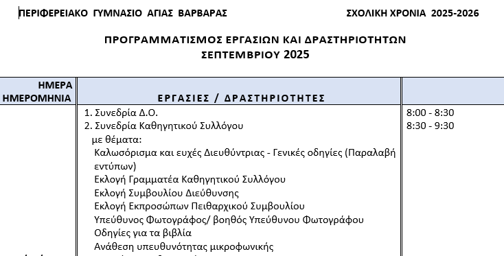 ΠΡΟΓΡΑΜΜΑΤΙΣΜΟΣ ΕΡΓΑΣΙΩΝ ΚΑΙ ΔΡΑΣΤΗΡΙΟΤΗΤΩΝ ΣΕΠΤΕΜΒΡΙΟΥ 2025 ΠΡΟΓΡΑΜΜΑΤΙΣΜΟΣ ΕΡΓΑΣΙΩΝ ΚΑΙ ΔΡΑΣΤΗΡΙΟΤΗΤΩΝ ΣΕΠΤΕΜΒΡΙΟΥ 2025 Διαβάστε περισσότερα επιλέγοντας εδώ.. ...