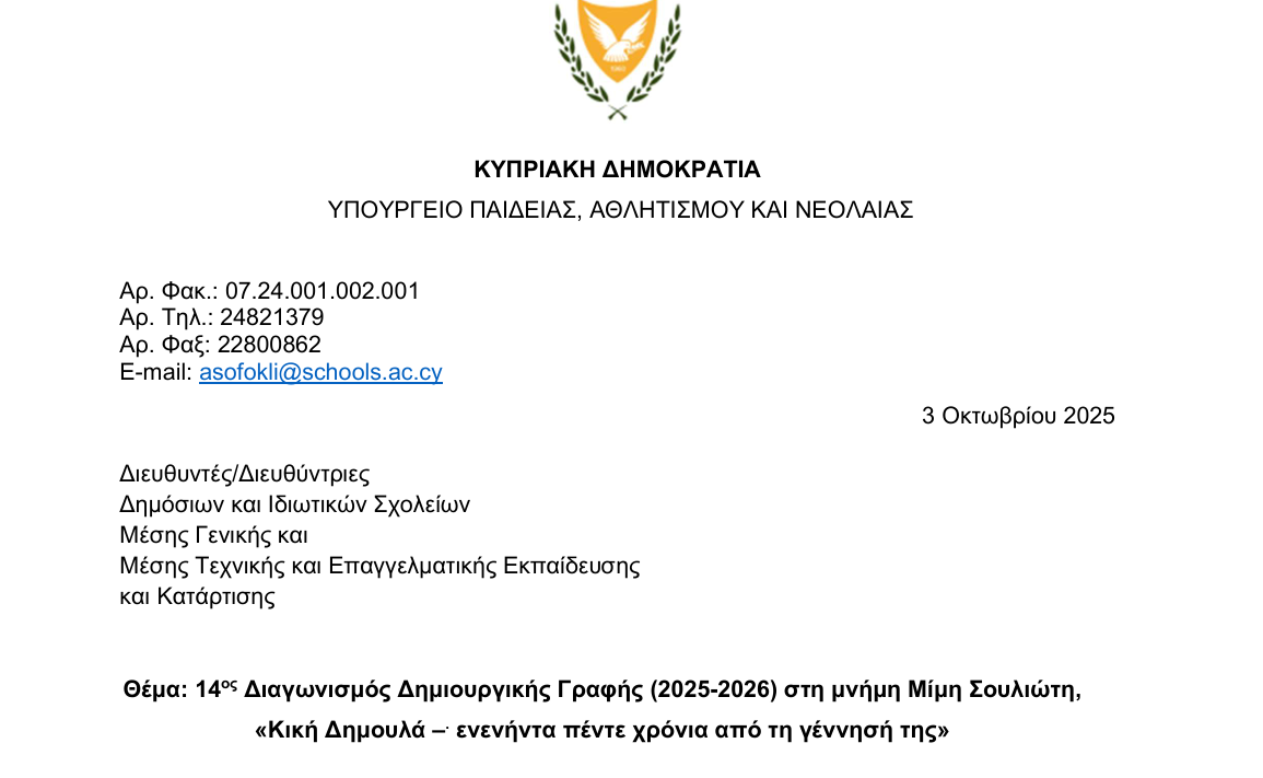 Διαγωνισμός Δημιουργικής Γραφής (2025-2026) στη μνήμη Μίμη Σουλιώτη, «Κική Δημουλά –. ενενήντα πέντε χρόνια από τη γέννησή της» Διαγωνισμός Δημιουργικής Γραφής (2025-2026) στη μνήμη Μίμη Σουλιώτη, «Κική Δημουλά –. ενενήντα πέντε χρόνια από τη γέννησή της» Διαβάστε περισσότερα επιλέγοντας εδώ και εδώ.. ...