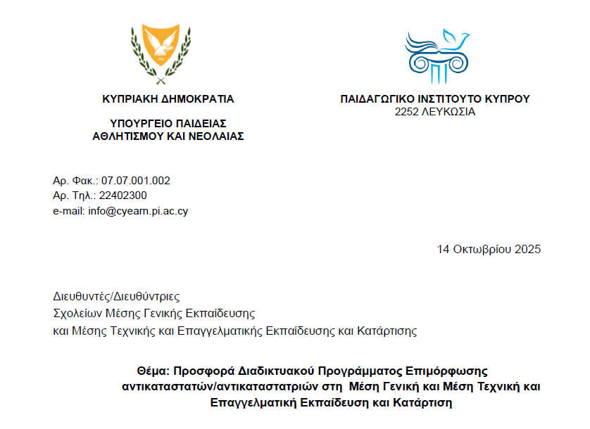 Προσφορά Διαδικτυακού Προγράμματος Επιμόρφωσης αντικαταστατών/αντικαταστατριών στη Μέση Γενική και Μέση Τεχνική και Επαγγελματική Εκπαίδευση και Κατάρτιση Προσφορά Διαδικτυακού Προγράμματος Επιμόρφωσης αντικαταστατών/αντικαταστατριών στη Μέση Γενική και Μέση Τεχνική και Επαγγελματική Εκπαίδευση και Κατάρτιση Διαβάστε περισσότερα επιλέγοντας εδώ και εδώ.. ...