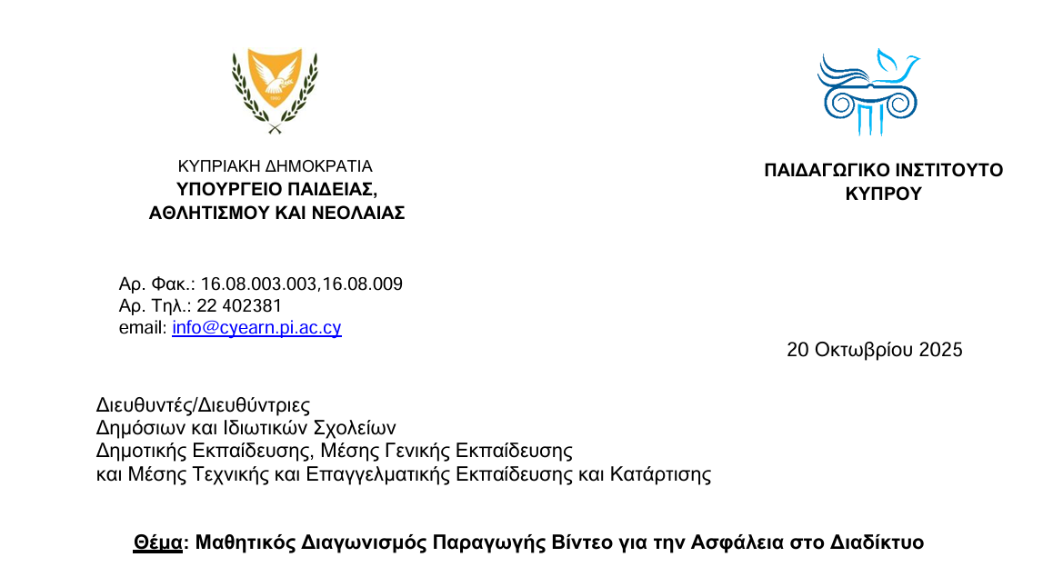 Προκήρυξη Μαθητικού Διαγωνισμού Παραγωγής Βίντεο για την Ασφάλεια στο Διαδίκτυο Προκήρυξη Μαθητικού Διαγωνισμού Παραγωγής Βίντεο για την Ασφάλεια στο Διαδίκτυο Διαβάστε περισσότερα επιλέγοντας εδώ και εδώ.. ...