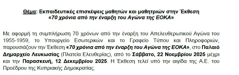 Εκπαιδευτικές επισκέψεις μαθητών και μαθητριών στην Έκθεση «70 χρόνια από την έναρξη του Αγώνα της ΕΟΚΑ» Εκπαιδευτικές επισκέψεις μαθητών και μαθητριών στην Έκθεση «70 χρόνια από την έναρξη του Αγώνα της ΕΟΚΑ» Διαβάστε περισσότερα επιλέγοντας εδώ.. ...