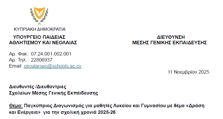 Παγκύπριος Διαγωνισμός για μαθητές Λυκείου και Γυμνασίου με θέμα «Δράση και Ενέργεια» για την σχολική χρονιά 2025-26 Παγκύπριος Διαγωνισμός για μαθητές Λυκείου και Γυμνασίου με θέμα «Δράση και Ενέργεια» για την σχολική χρονιά 2025-26 Διαβάστε περισσότερα επιλέγοντας εδώ και εδώ.. ...
