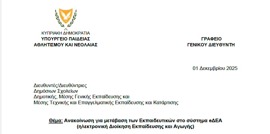 Ανακοίνωση για μετάβαση των Εκπαιδευτικών στο σύστημα eΔΕΑ (ηλεκτρονική Διοίκηση Εκπαίδευσης και Αγωγής) Ανακοίνωση για μετάβαση των Εκπαιδευτικών στο σύστημα eΔΕΑ (ηλεκτρονική Διοίκηση Εκπαίδευσης και Αγωγής) Διαβάστε περισσότερα επιλέγοντας εδώ.. ...