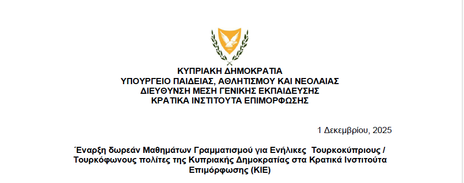 Έναρξη δωρεάν Μαθημάτων Γραμματισμού για Ενήλικες Τουρκοκύπριους / Τουρκόφωνους πολίτες της Κυπριακής Δημοκρατίας στα Κρατικά Ινστιτούτα Επιμόρφωσης (ΚΙΕ) Έναρξη δωρεάν Μαθημάτων Γραμματισμού για Ενήλικες Τουρκοκύπριους / Τουρκόφωνους πολίτες της Κυπριακής Δημοκρατίας στα Κρατικά Ινστιτούτα Επιμόρφωσης (ΚΙΕ) Διαβάστε περισσότερα επιλέγοντας εδώ και εδώ.. ...