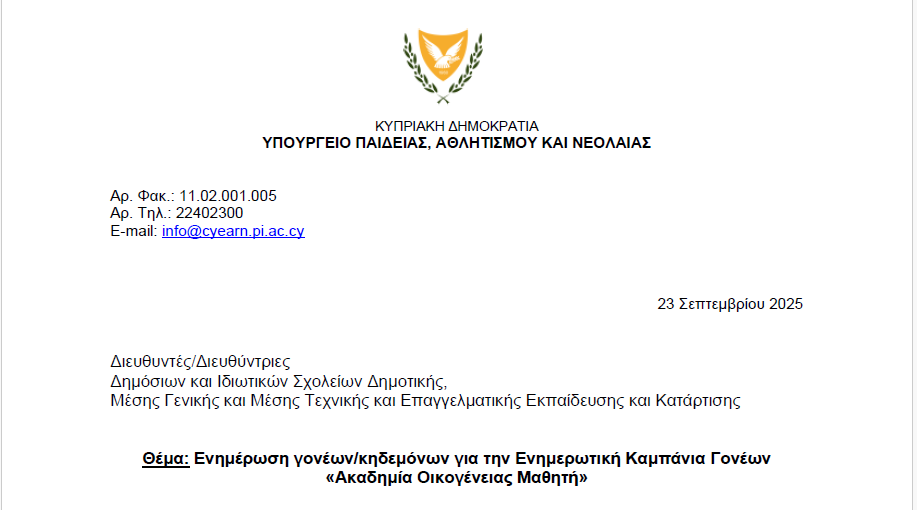 Ενημέρωση γονέων/κηδεμόνων για την Ενημερωτική Καμπάνια Γονέων «Ακαδημία Οικογένειας Μαθητή» Ενημέρωση γονέων/κηδεμόνων για την Ενημερωτική Καμπάνια Γονέων «Ακαδημία Οικογένειας Μαθητή» Διαβάστε περισσότερα επιλέγοντας εδώ και εδώ.. ...