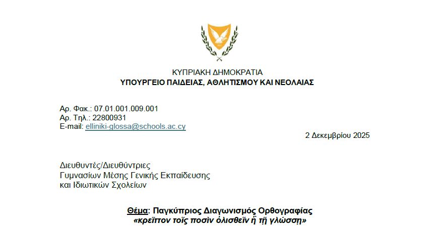 Παγκύπριος Διαγωνισμός Ορθογραφίας «κρεῖττον τοῖς ποσὶν ὀλισθεῖν ἢ τῇ γλώσσῃ» Παγκύπριος Διαγωνισμός Ορθογραφίας «κρεῖττον τοῖς ποσὶν ὀλισθεῖν ἢ τῇ γλώσσῃ» Διαβάστε περισσότερα επιλέγοντας εδώ,εδώ και εδώ.. ...