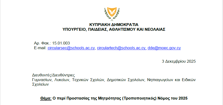 Ο περί Προστασίας της Μητρότητας (Τροποποιητικός) Νόμος του 2025 Ο περί Προστασίας της Μητρότητας (Τροποποιητικός) Νόμος του 2025 Διαβάστε περισσότερα επιλέγοντας εδώ.. ...