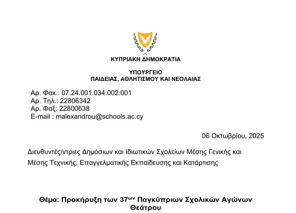 Προκήρυξη των 37 ων Παγκύπριων Σχολικών Αγώνων Θεάτρου Το Υπουργείο Παιδείας, Αθλητισμού και Νεολαίας (ΥΠΑΝ) και ο Θεατρικός Οργανισμός Κύπρου (ΘΟΚ) προκηρύσσουν τους 37ους Παγκύπριους Σχολικούς Αγώνες Θεάτρου, για την σχολική χρονιά 2025-26. Προκήρυξη των 37 ων Παγκύπριων Σχολικών Αγώνων Θεάτρου Το Υπουργείο Παιδείας, Αθλητισμού και Νεολαίας (ΥΠΑΝ) και ο Θεατρικός Οργανισμός Κύπρου (ΘΟΚ) προκηρύσσουν τους 37ους Παγκύπριους Σχολικούς Αγώνες Θεάτρου, για την σχολική χρονιά 2025-26. Διαβάστε περισσότερα επιλέγοντας εδώ.. ...
