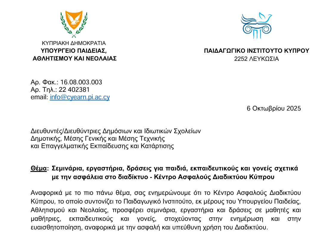 Σεμινάρια, εργαστήρια, δράσεις για παιδιά, εκπαιδευτικούς και γονείς σχετικά με την ασφάλεια στο διαδίκτυο - Κέντρο Ασφαλούς Διαδικτύου Κύπρου Σεμινάρια, εργαστήρια, δράσεις για παιδιά, εκπαιδευτικούς και γονείς σχετικά με την ασφάλεια στο διαδίκτυο - Κέντρο Ασφαλούς Διαδικτύου Κύπρου Διαβάστε περισσότερα επιλέγοντας εδώ.. ...