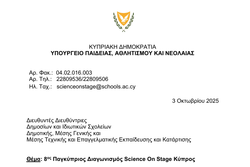 8ος Παγκύπριος Διαγωνισμός Science On Stage Κύπρος 8ος Παγκύπριος Διαγωνισμός Science On Stage Κύπρος Διαβάστε περισσότερα επιλέγοντας εδώ,εδώ και εδώ.. ...